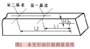 (1)先選取臂桿上未變形的部位做為基準,測量原座孔的位置,為防止出現(xiàn)大的誤差,選取2個基準分別測量(見圖1),并將數(shù)據(jù)進行比較分析,取接近的數(shù)據(jù);實際作法是挖掉變形部位,補上新板后,并在其基準位置做好標記。