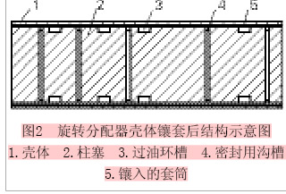 先將分配器殼體原環(huán)形凸臺全部鏜平,后鑲?cè)胝w缸套;為了使原環(huán)形油道的截面積不變,保證原液壓系統(tǒng)的流量和壓力,須加深柱塞的環(huán)形油道(見圖2)。具體工藝如下: